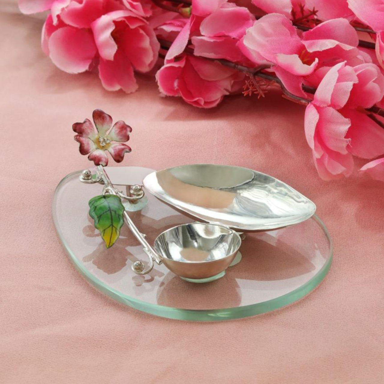 This delicate and modern oval-shaped silver chopda with enamel accents and a glass base is both festive...