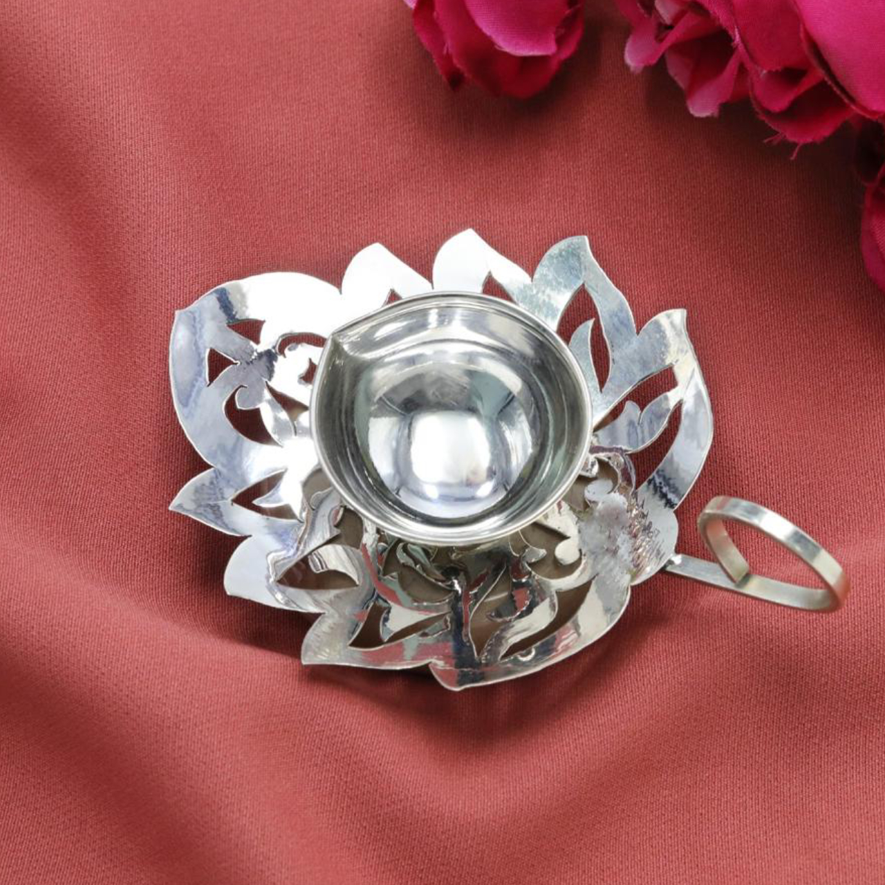 This delicate and modern oval-shaped silver chopda with enamel accents and a glass base is both festive...