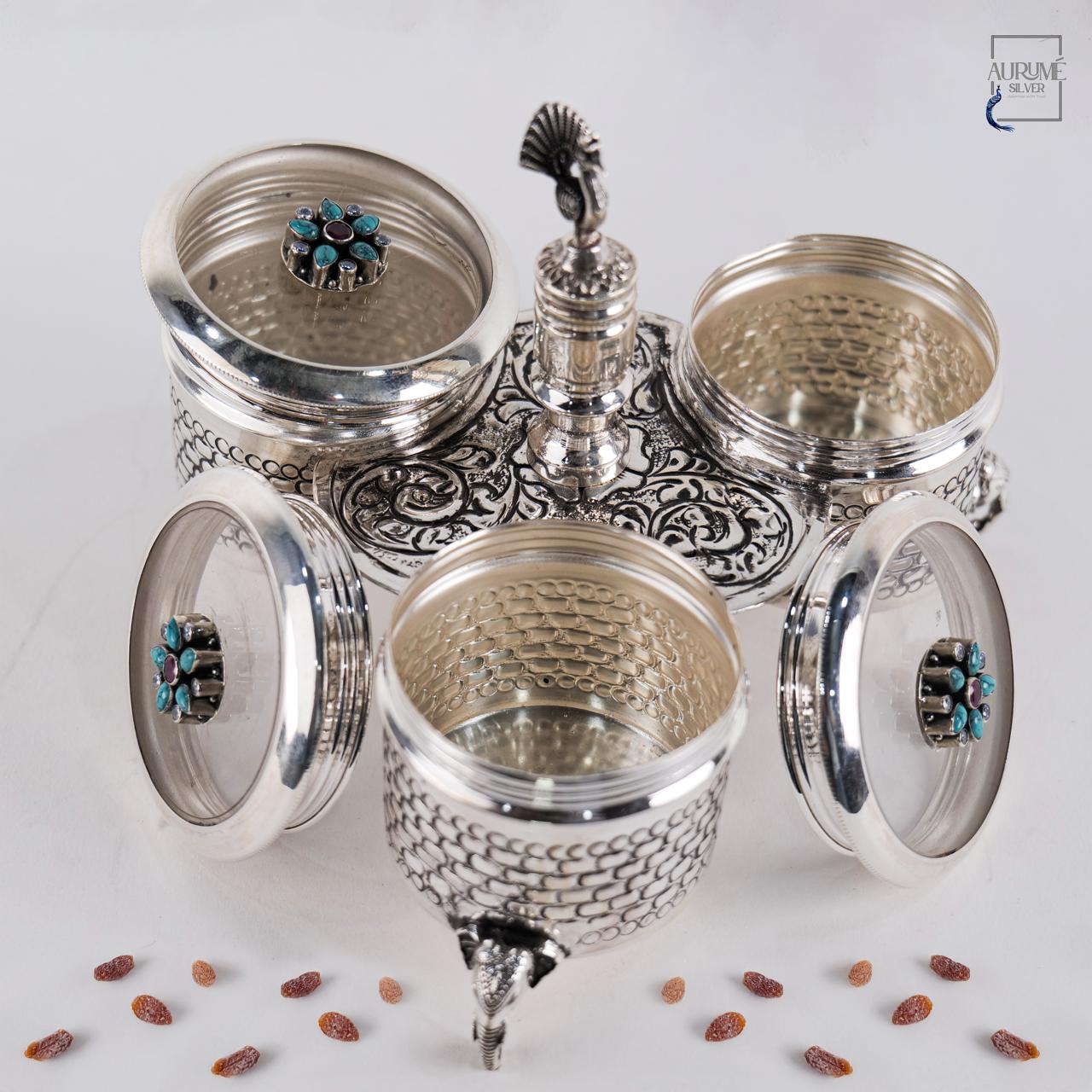 A stunning fusion of elegance and utility, this three-bowl silver spice holder features a majestic elephant motif...