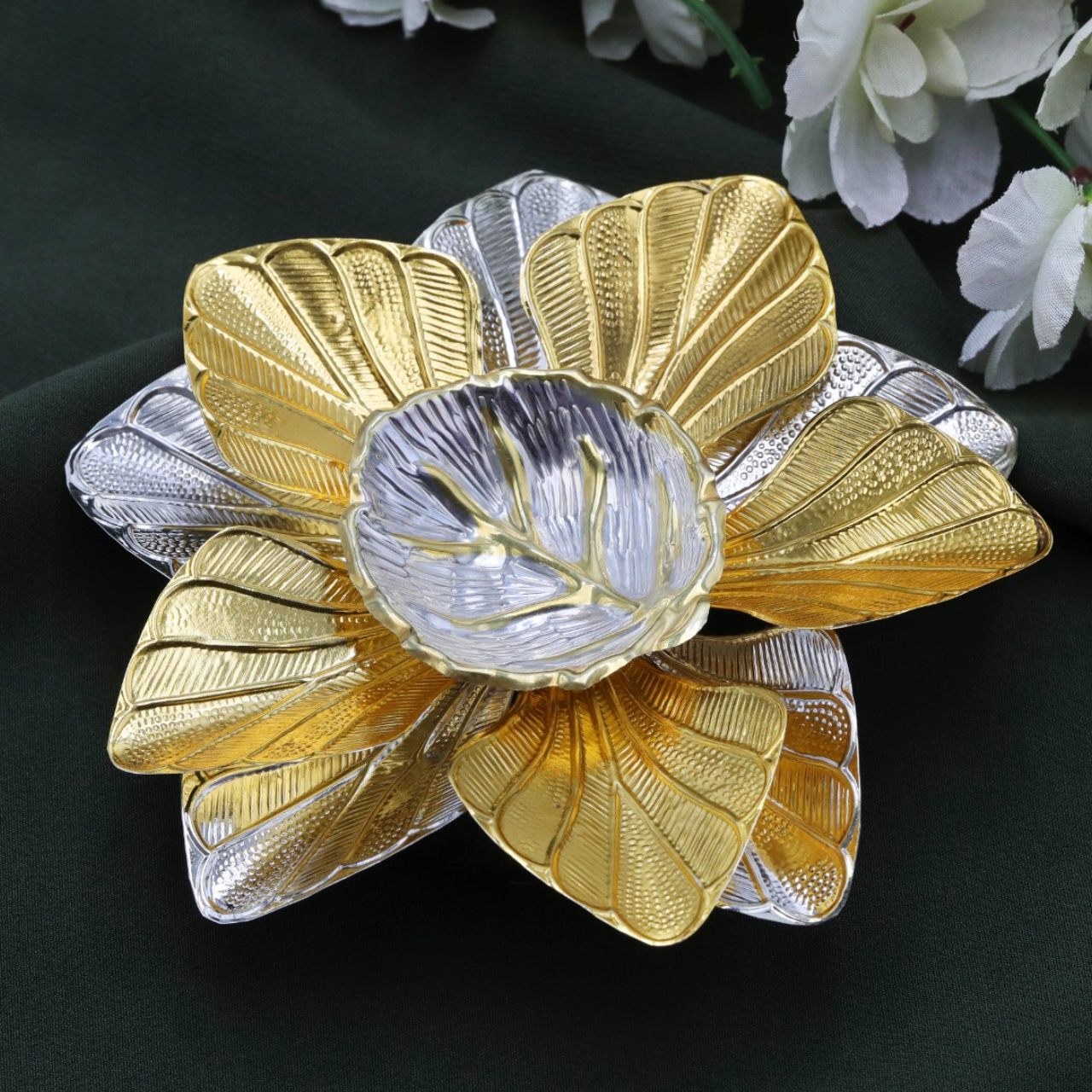 Embrace the warmth of tradition with the Lotus Flame Leaf Diya, a delicately sculpted diya in the...