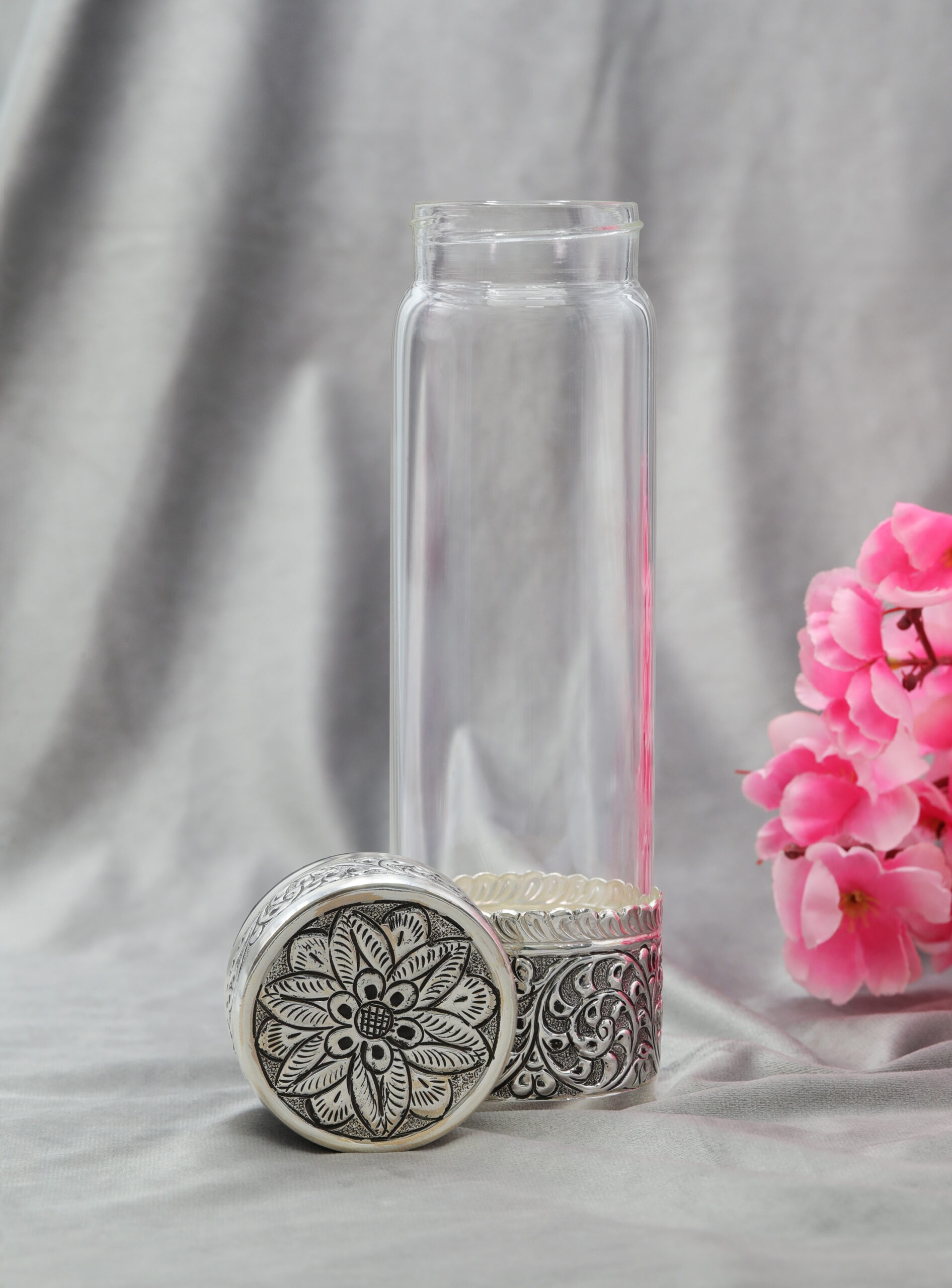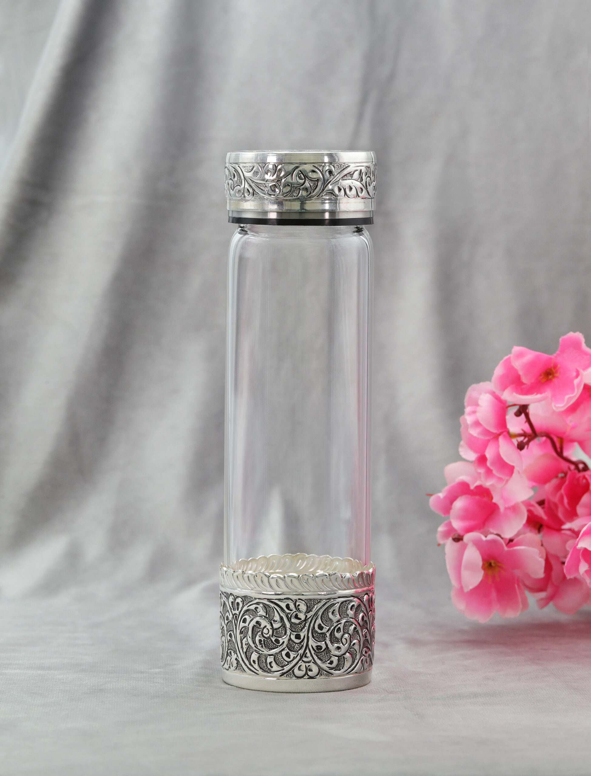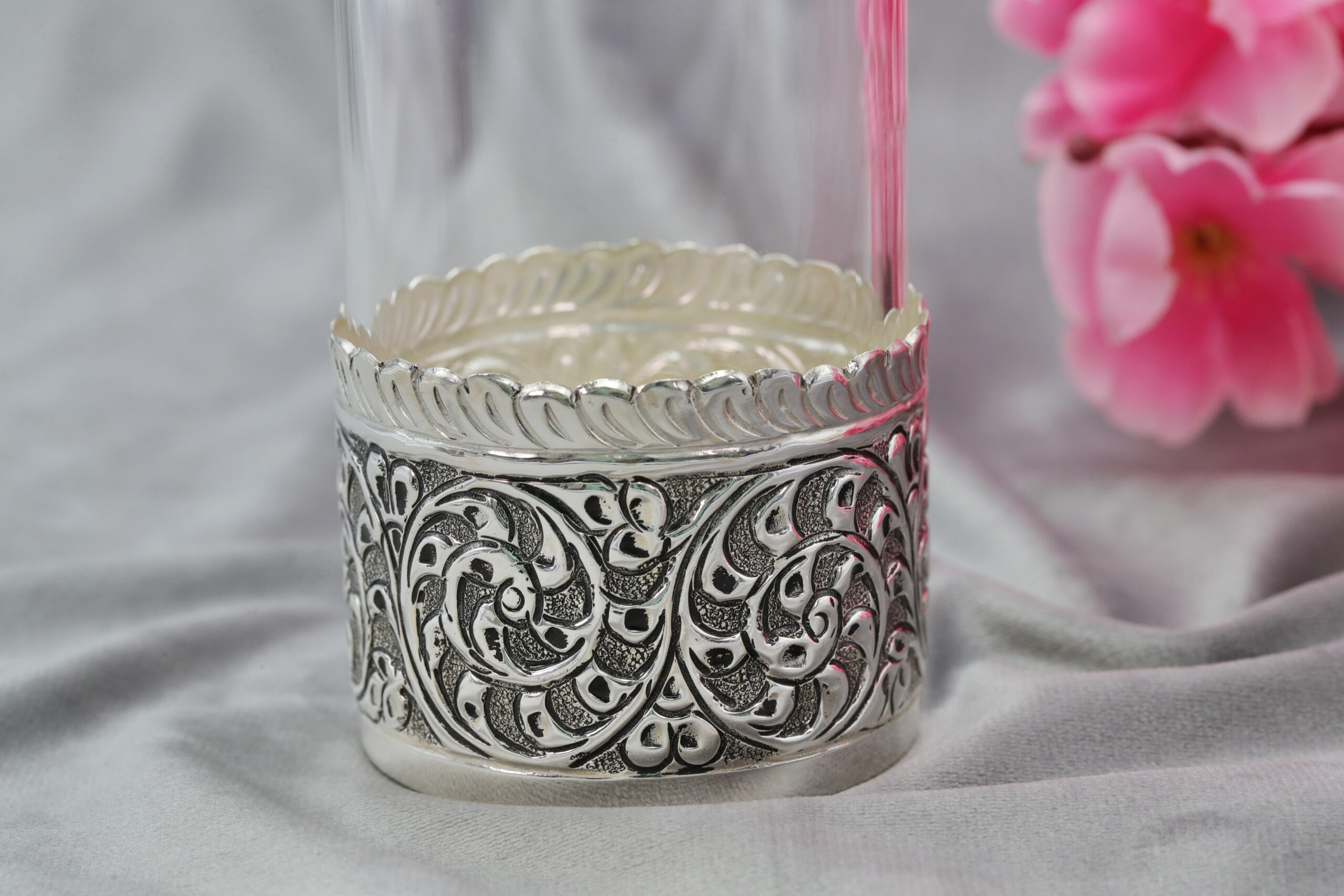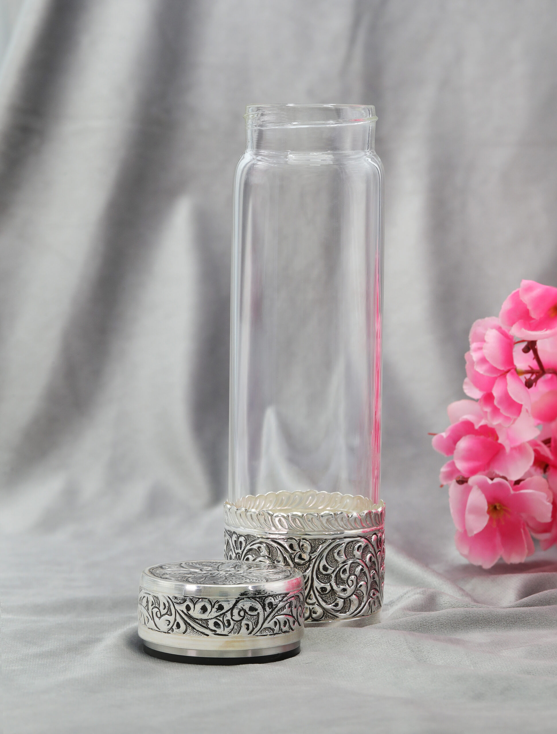 Crafted to blend wellness with artistry, this 1-litre glass water bottle is crowned with intricately carved 925 pure silver on its lid and base. The floral motifs symbolize purity and prosperity, while the sleek glass body adds a touch of modern minimalism. More than just a vessel, it is an heirloom piece — carrying both water and the legacy of Aurumé’s unmatched craftsmanship. Perfect for elegant living and meaningful gifting.