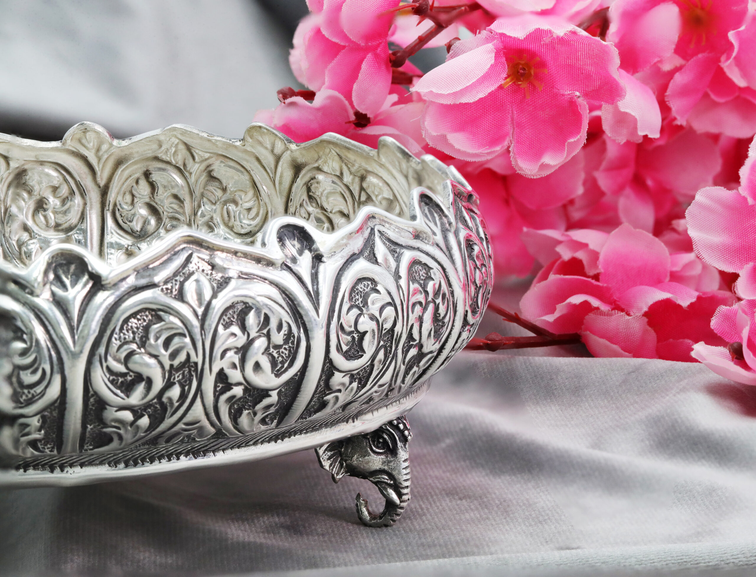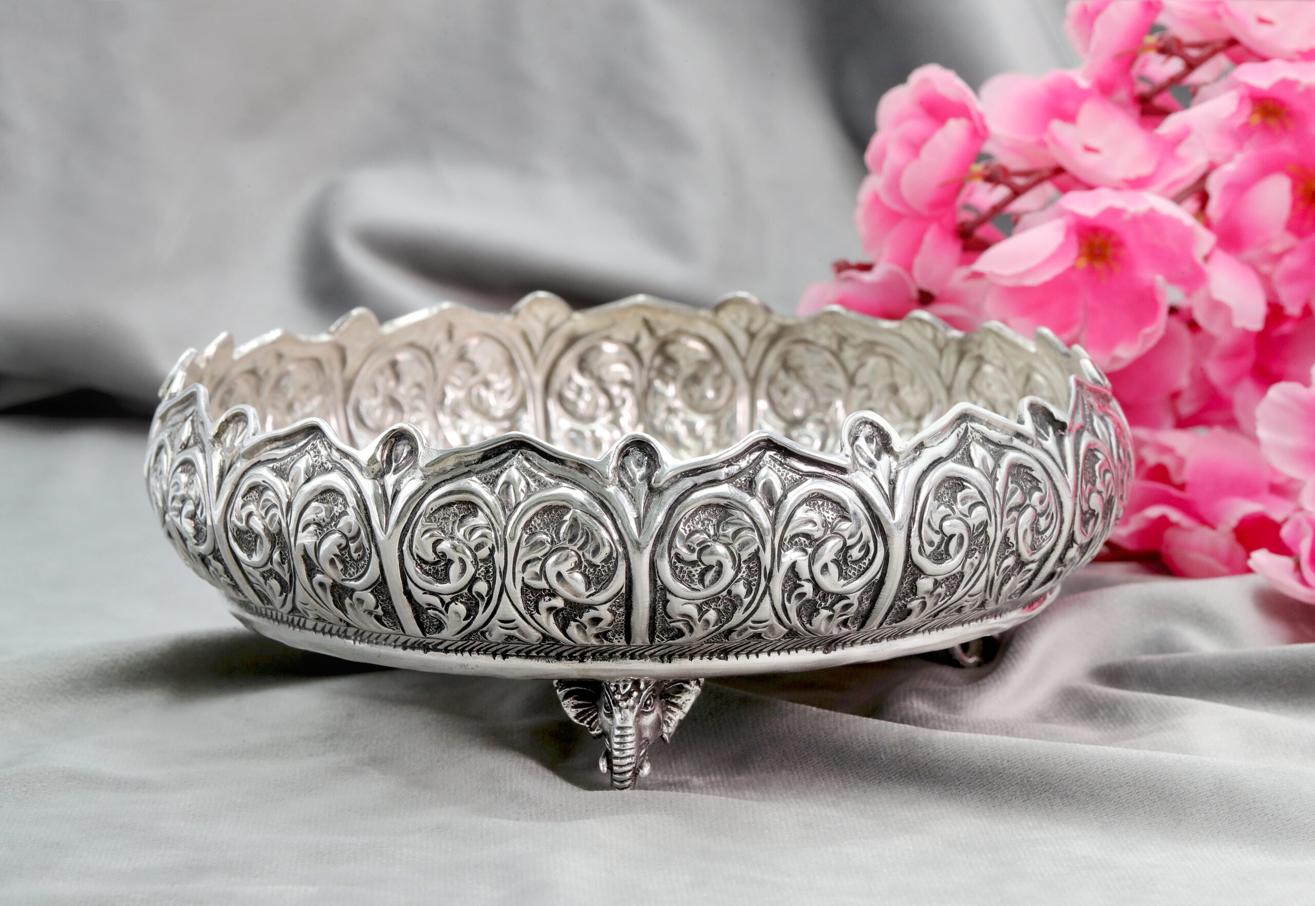 Immerse in the elegance of timeless tradition with the Aurumé Lotus Vine Silver Urli, crafted in 925 Sterling Silver and weighing approximately 425 grams. Measuring 7 inches in diameter and 3 inches in height, this urli is a stunning blend of delicate craftsmanship and regal design, making it a captivating centerpiece for your festive décor.