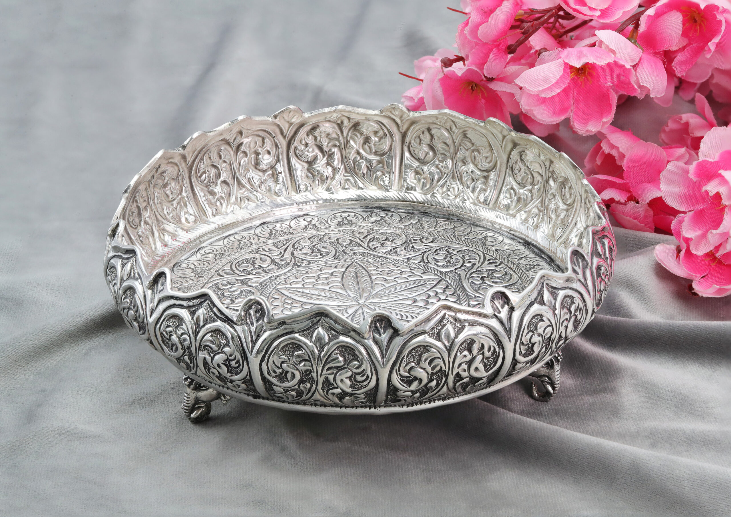 The urli’s surface is intricately adorned with hand-embossed lotus petal patterns and swirling vine motifs, symbolizing purity, prosperity, and eternal growth. The inner base showcases a mesmerizing mandala-inspired floral design, radiating intricate artistry and depth. The scalloped, arched rim is meticulously crafted with traditional jaali (lattice) work, enhanced with antique oxidized detailing, which beautifully contrasts with the mirror-polished highlights.