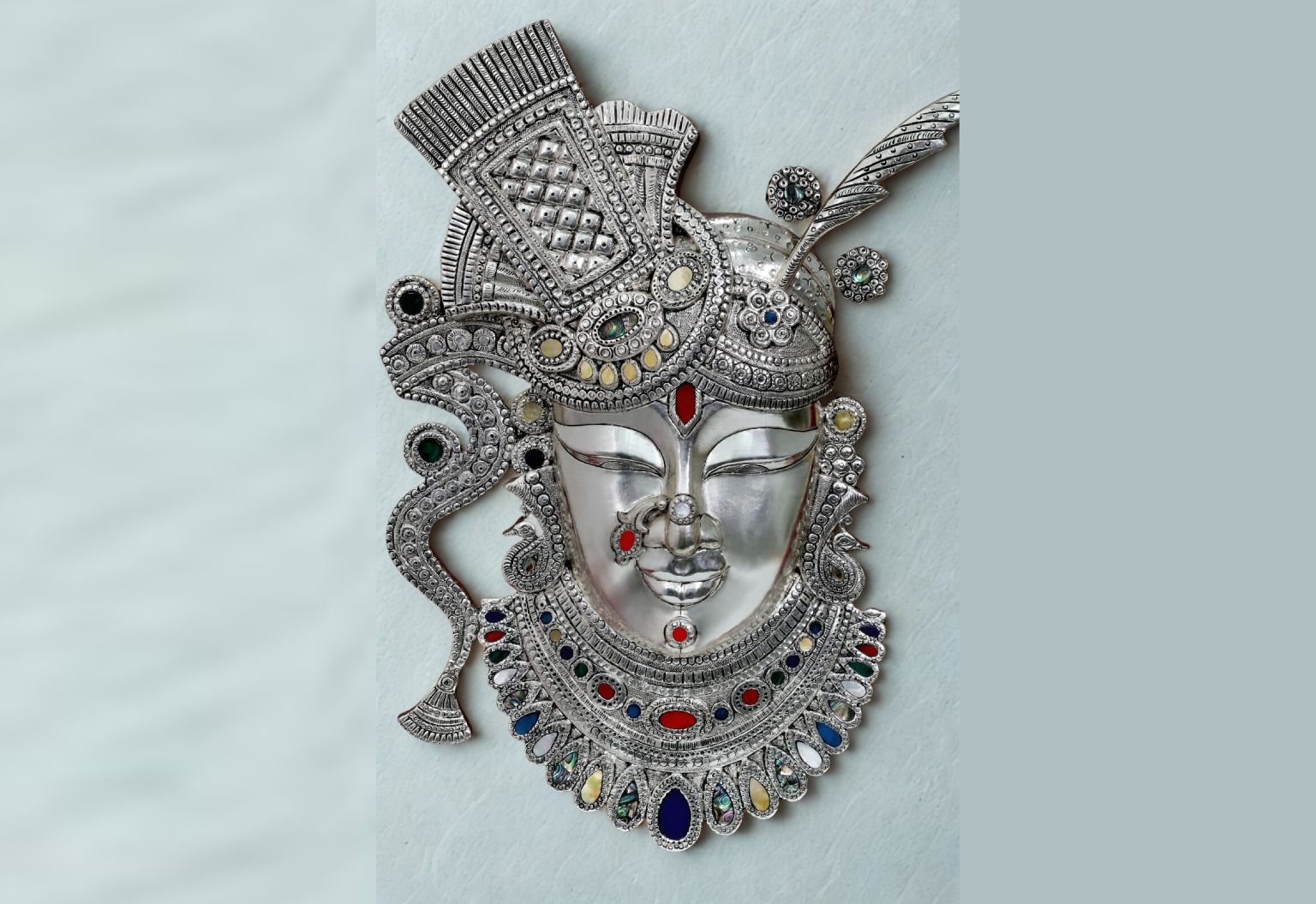 Adorned with a radiant arrangement of semi-precious stones and luminous MOP accents, every element of this 30″ x 22″ composition reflects royalty and reverence. The crown, jewelry, and expressive features of the deity are meticulously embellished to evoke the grandeur of Nathdwara’s temple artistry. This piece is more than decor—it’s a sacred heirloom that radiates peace, devotion, and timeless Indian artistry. Specifications: Material: Pure 999 Silver Sheet (550g) on Divine Teak Wood Dimensions: 30″ x 22″ Embellishments: Semi-precious stones and Mother of Pearl (MOP) Style: Nathdwara-inspired sacred wall art Finish: Hand-embossed detailing with luxurious polish Ideal For: Invite divinity into your space. Adorn with trust. |