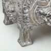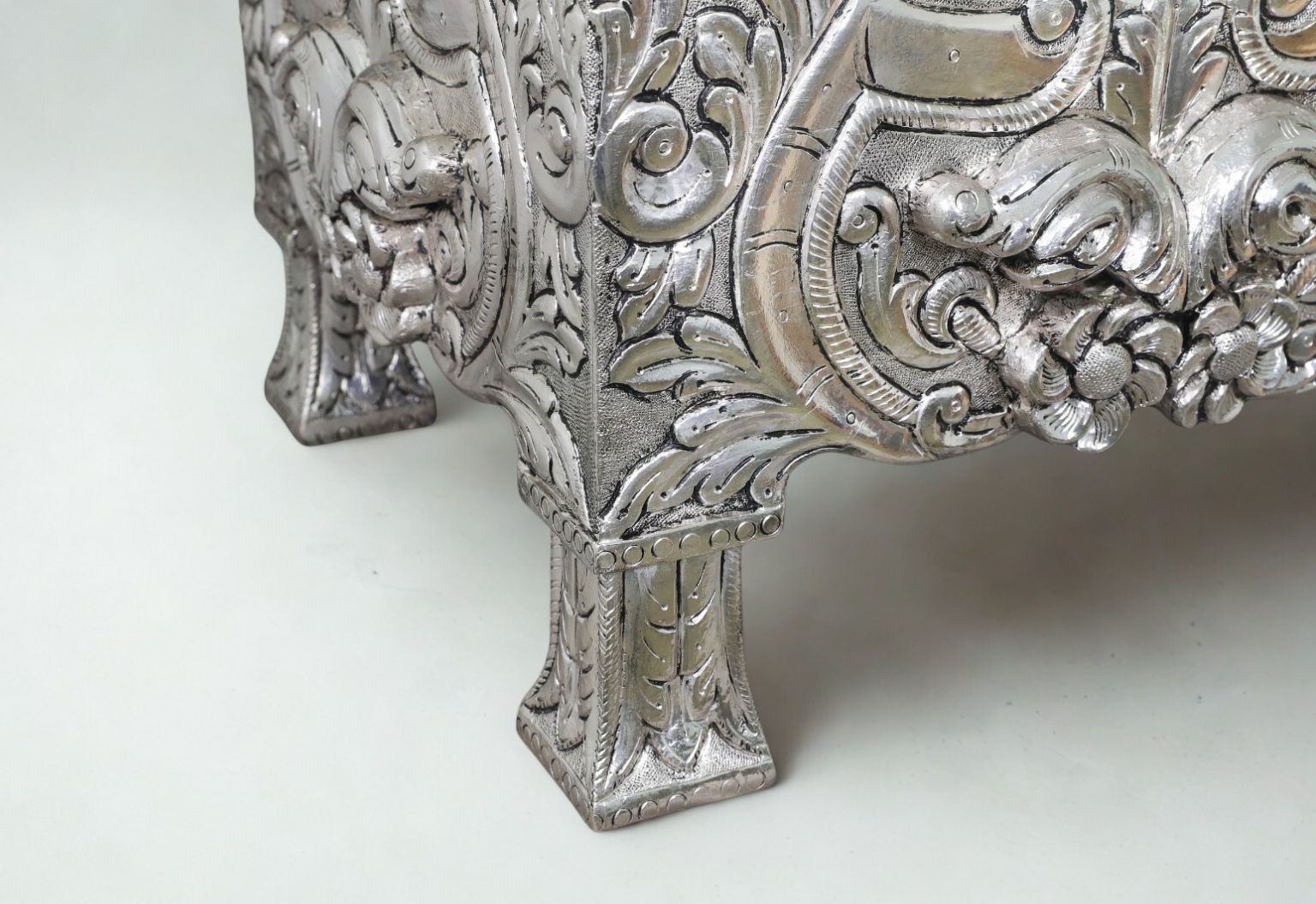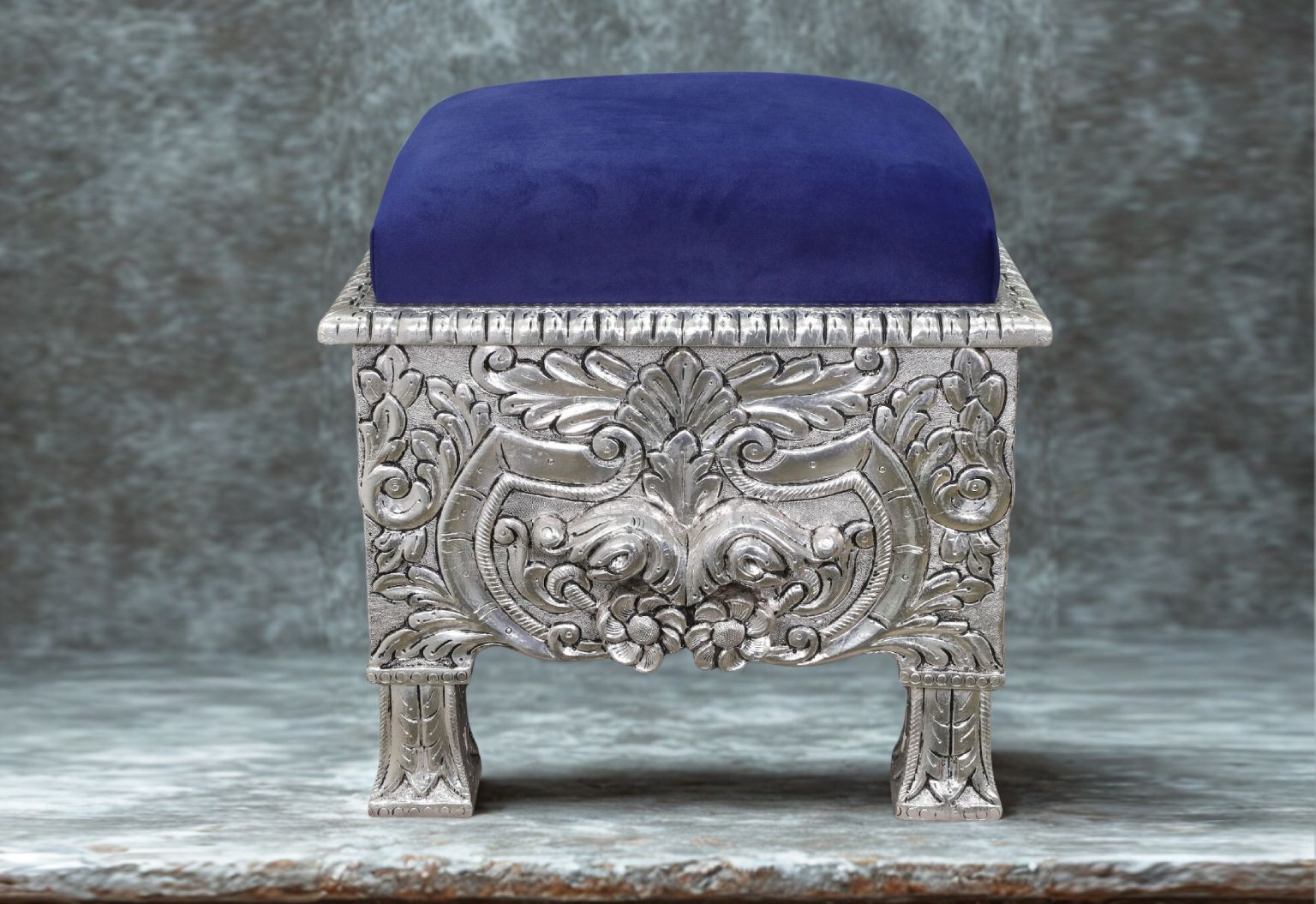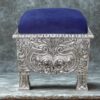 Topped with a deep blue velvet cushion for a regal finish, this stool serves as the perfect throne for spiritual rituals, bridal seating, or elegant interiors. Its bold structure and intricate carving showcase the highest level of Indian silver artistry, blending tradition with opulence. Specifications: Material: Premium Teak Wood with 999 Silver Sheet Silver Weight: 380 grams Dimensions: 18″ x 18″ Seat: Padded cushion in royal blue velvet Design: Hand-embossed with floral and lion motifs Finish: Antique oxidized silver with rich textural depth Ideal For: Crafted for royalty – Adorn with trust. |
