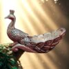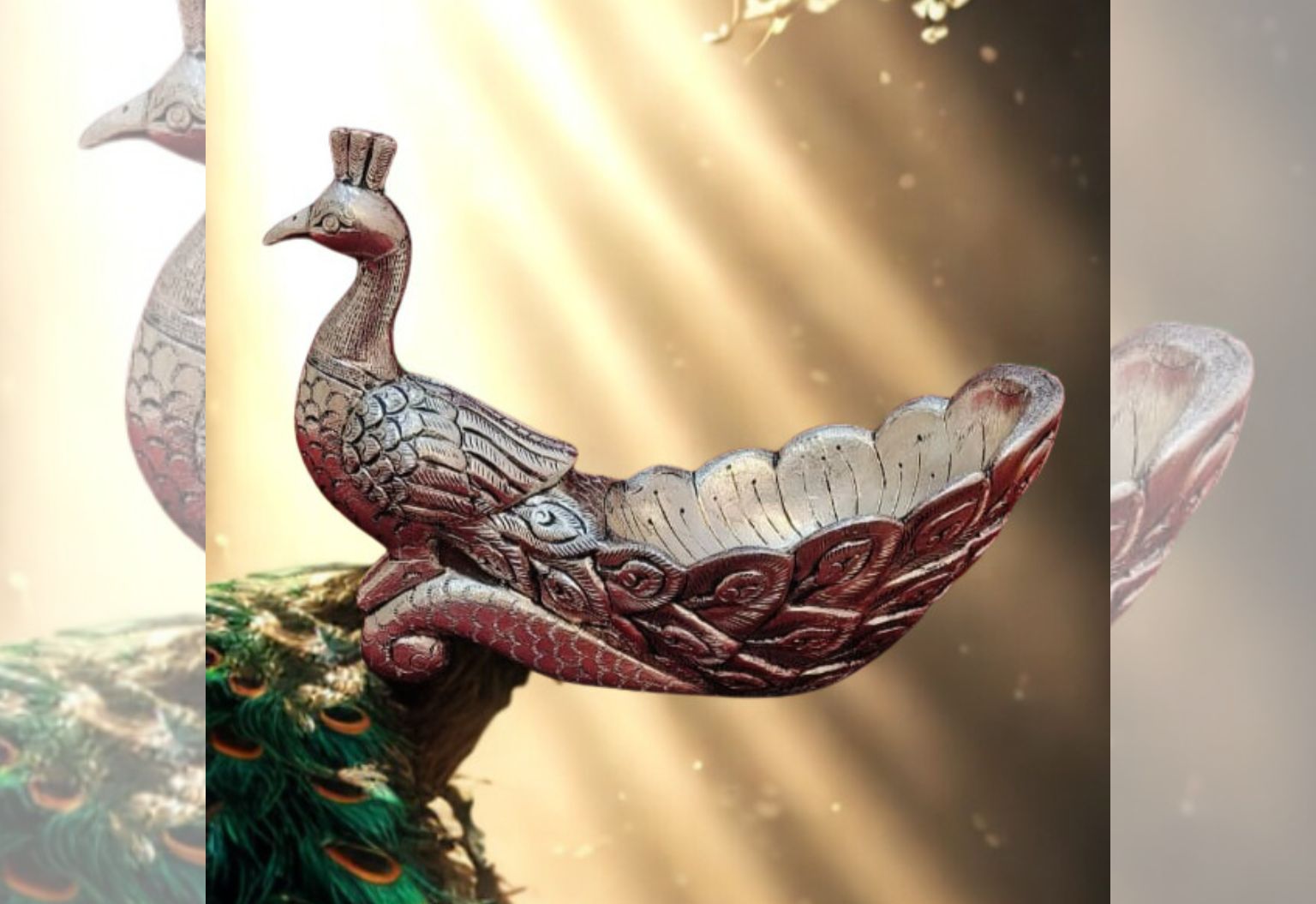 Intricately crafted to echo the splendor of India’s national bird, the Aurumé Silver Mayur Vilas Basket is a 10-inch marvel, sculpted from premium teak wood and embellished with 120 grams of pure 999 silver sheet. Designed in the form of a peacock in repose, its flowing tail forms a graceful scalloped basket, etched with detailed feathers, scales, and ornamental patterns.