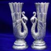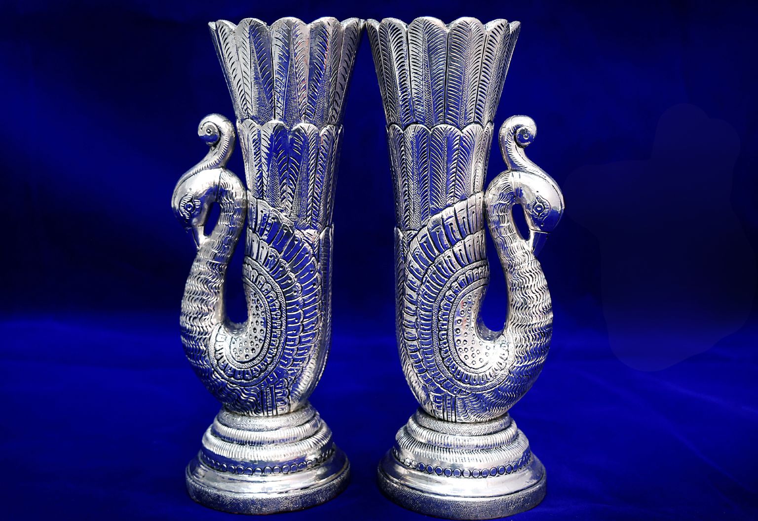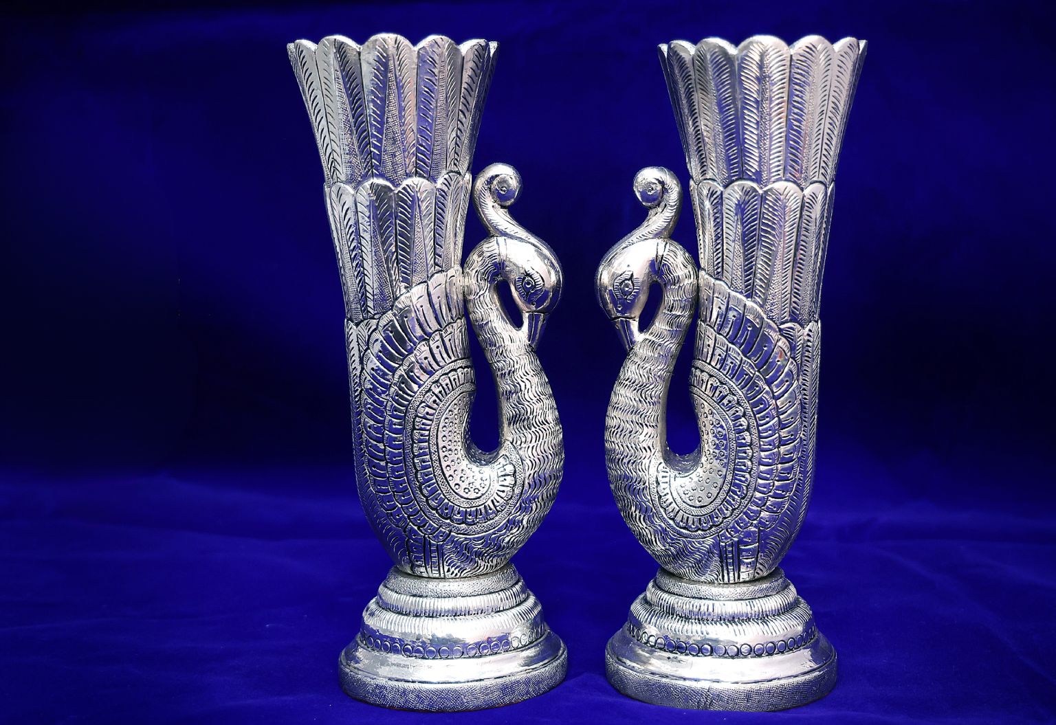 The feathered detailing, curved neck, and finely embossed textures bring these vases to life—making them more than décor, they are statements of Indian craftsmanship and heritage. Whether used as flower holders or displayed as artistic showpieces, this pair radiates charm and sophistication. Specifications: Material: Teak Wood with 999 Silver Sheet Overlay Silver Weight: 130 grams per vase (180 grams for the pair) Height: 12 inches each Design: Hand-embossed peacock feather and form Finish: High-polish with oxidized details for depth Ideal For: Grace your space with timeless beauty – Adorn with trust. |