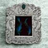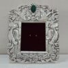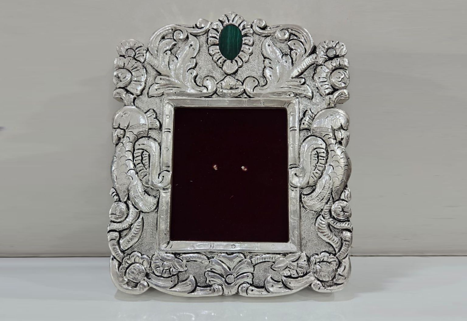 A beautifully placed green enamel accent crowns the top, while the central window—perfect for showcasing a peacock feather or sacred image—exudes elegance and tranquility. Ideal for pooja rooms, meditation corners, or meaningful gifting. Specifications: Material: Teak Wood with 999 Silver Sheet Overlay Silver Weight: 65 grams Size: 10″ x 12″ Design: Intricate floral and temple-inspired motifs with enamel detail Finish: Antique oxidized silver with hand-polished highlights Display: Wall mount or tabletop ready Ideal For: Where tradition frames divinity – Adorn with trust. |