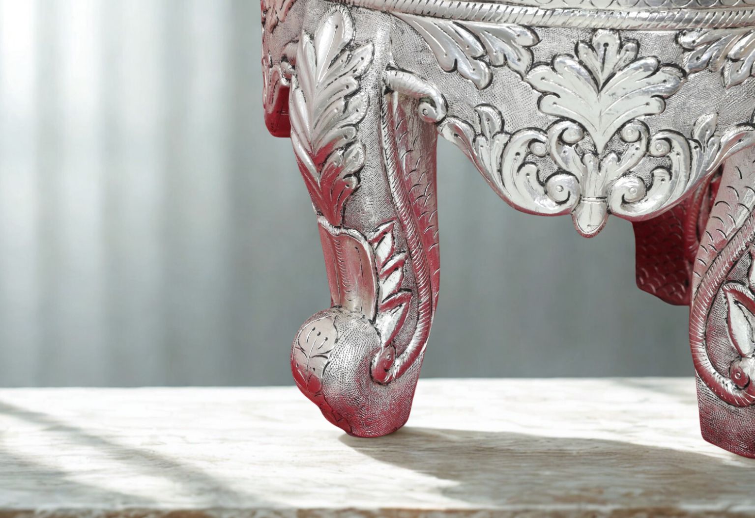 | Bring regal elegance and timeless tradition into your space with the Aurumé Silver Rajat Takhat, a beautifully carved round stool crafted from durable teak wood and finished with an exquisite 999 silver sheet overlay weighing 189 grams. Measuring 16” x 16”, this richly detailed stool features hand-engraved floral and leaf motifs and is topped with a plush mustard-yellow cushion, offering both luxury and comfort. |