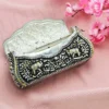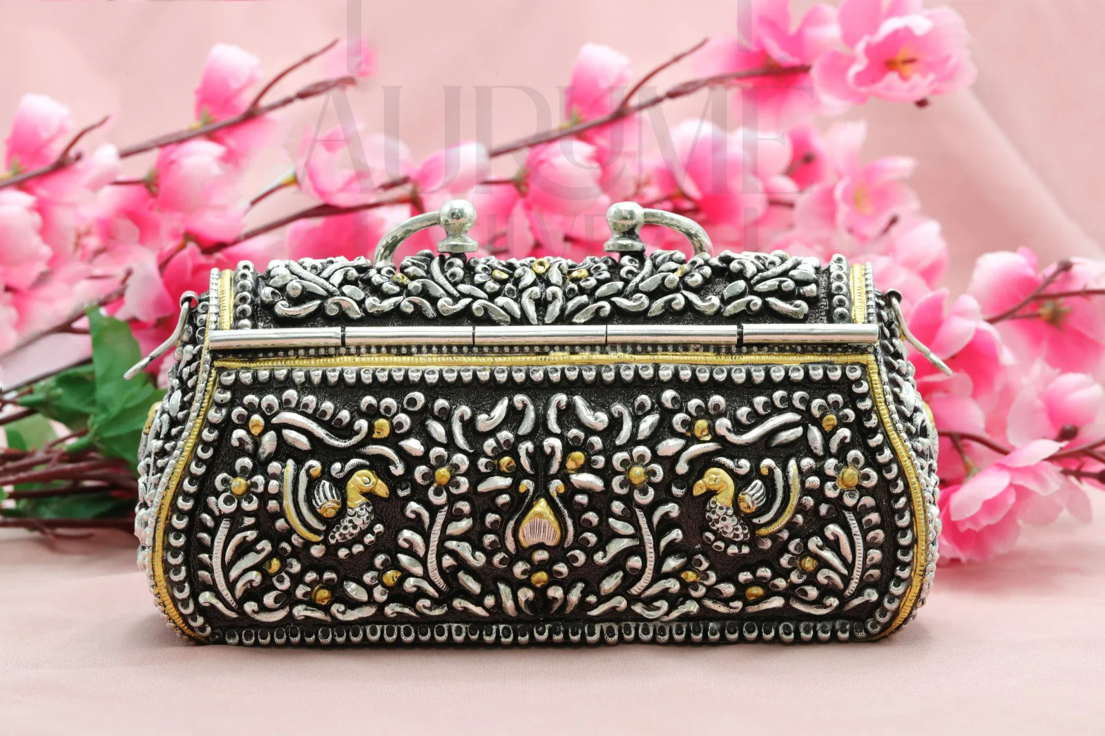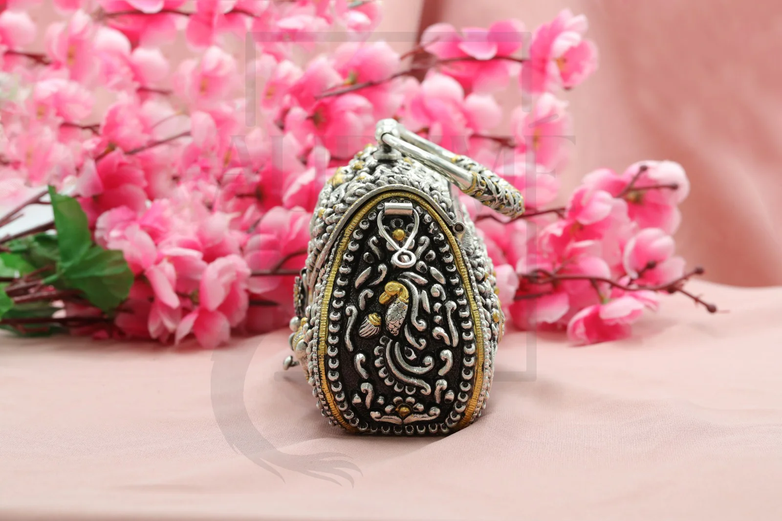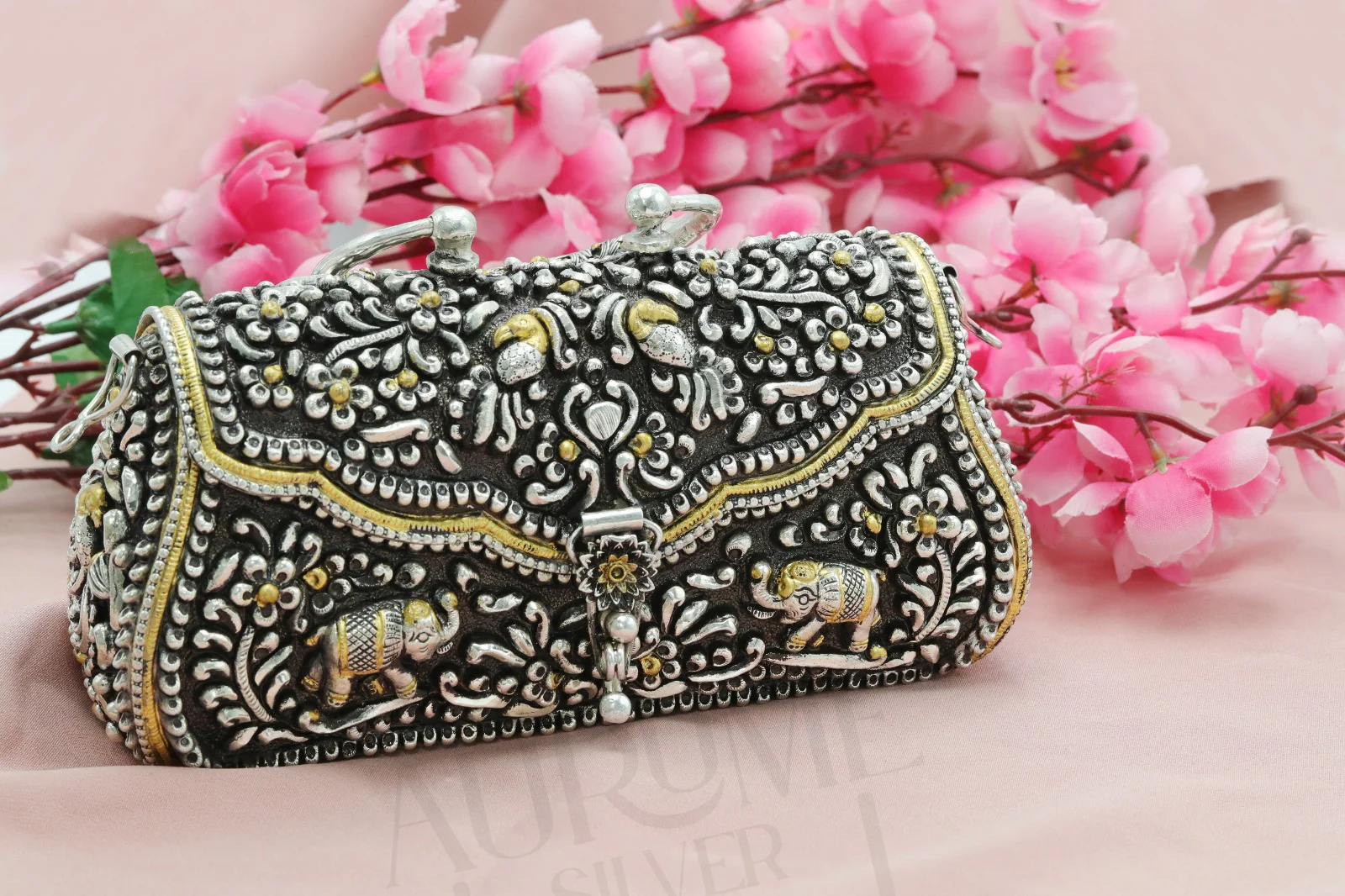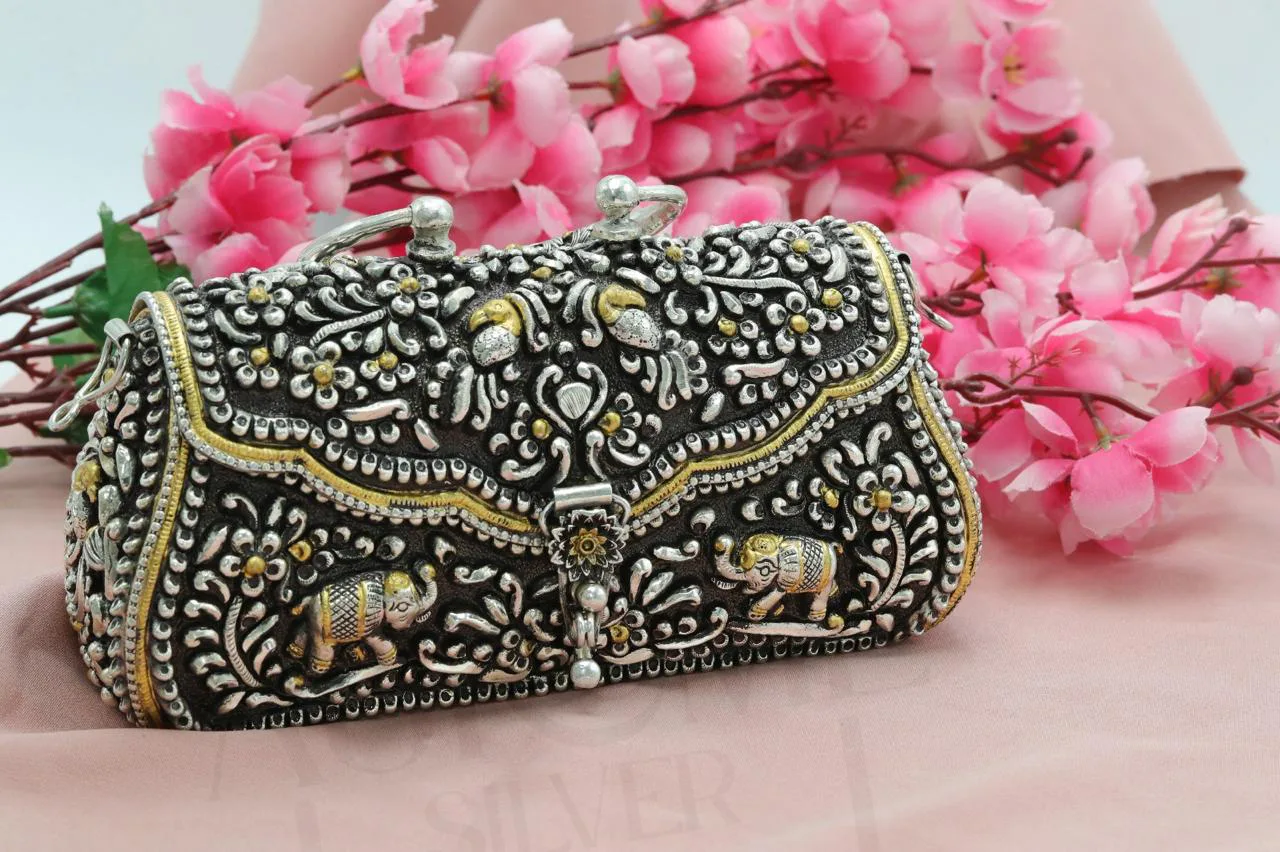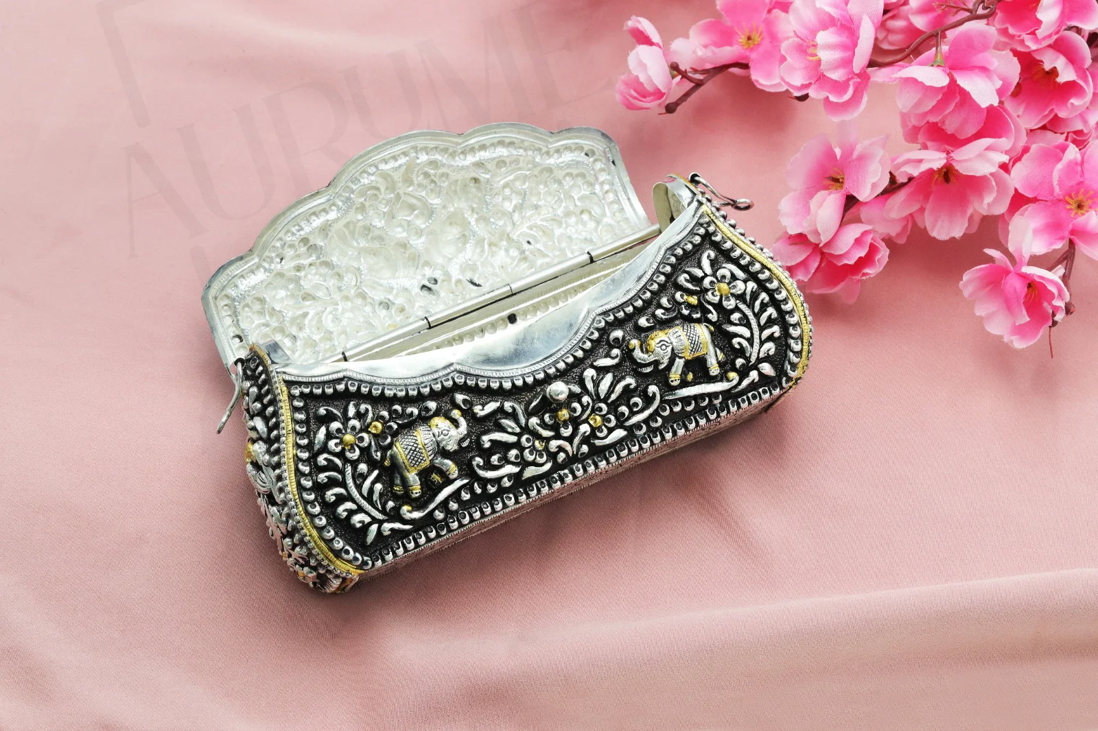 The visual story is one of royal processions through flowering gardens, capturing the essence of traditional Indian celebration. With its strong repoussé technique and antique finish, the purse balances utility and heritage with timeless grace.