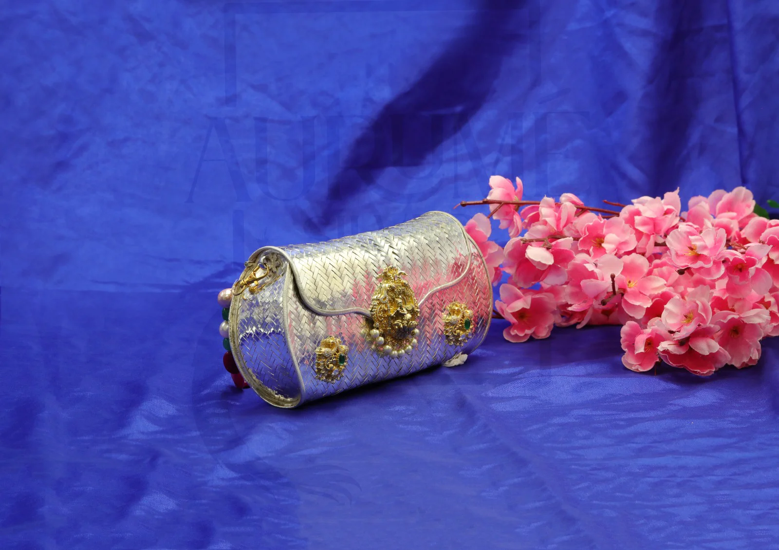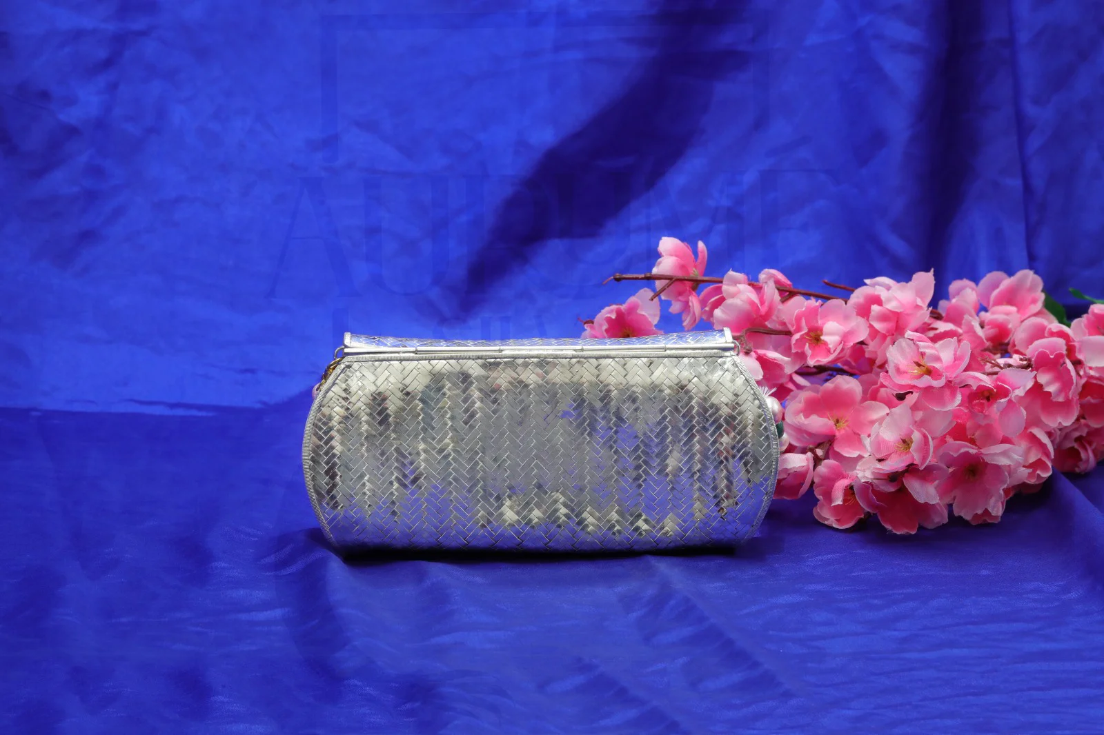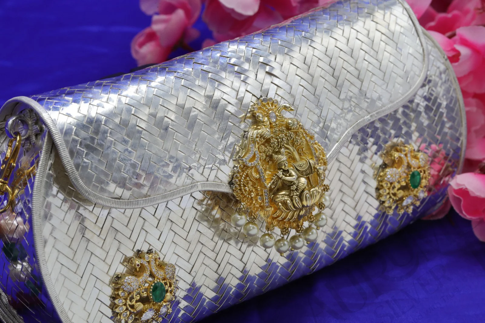 A divine blend of sacred symbolism and contemporary silhouette, the Shrinika Clutch is a handcrafted treasure that embodies grace, tradition, and prestige. Weighing 487 grams of 92.5% pure silver and measuring 9 inches (L) X 2 inches (W) x 5 inches (H), this semi-crescent clutch seamlessly fuses temple elegance with woven artistry.
