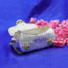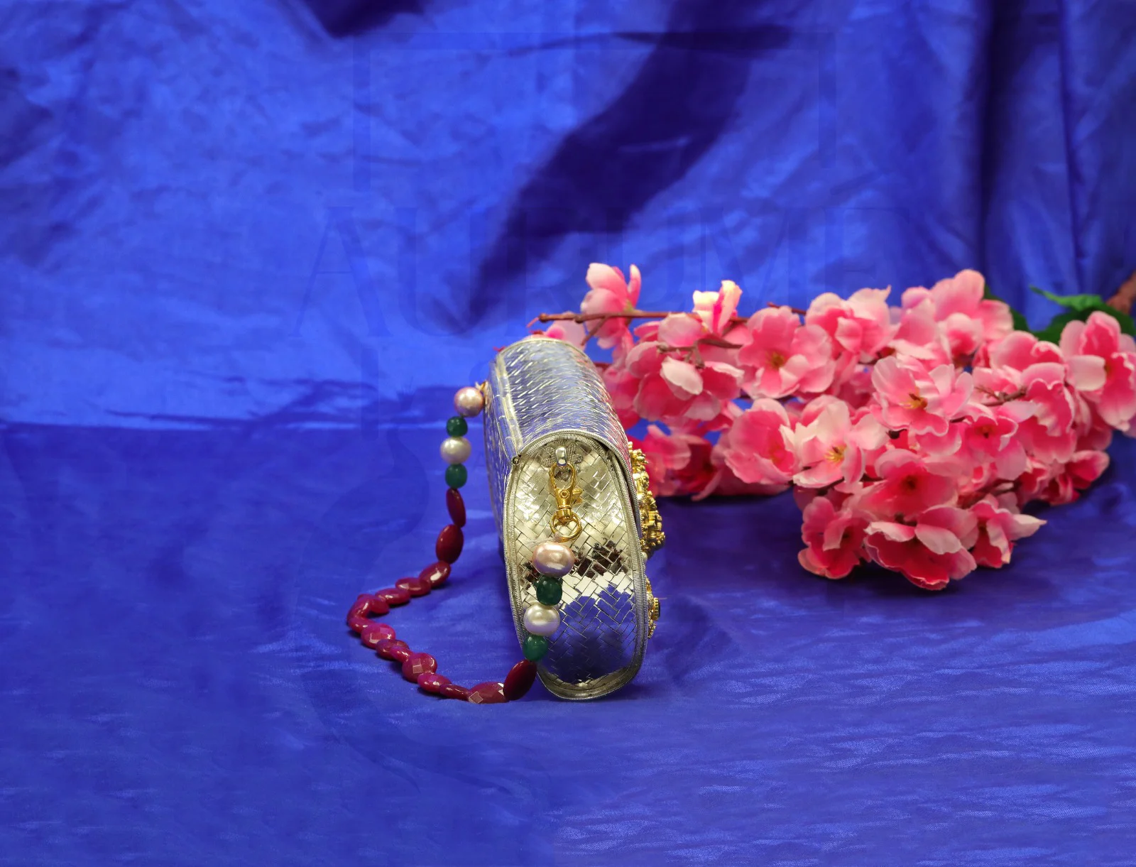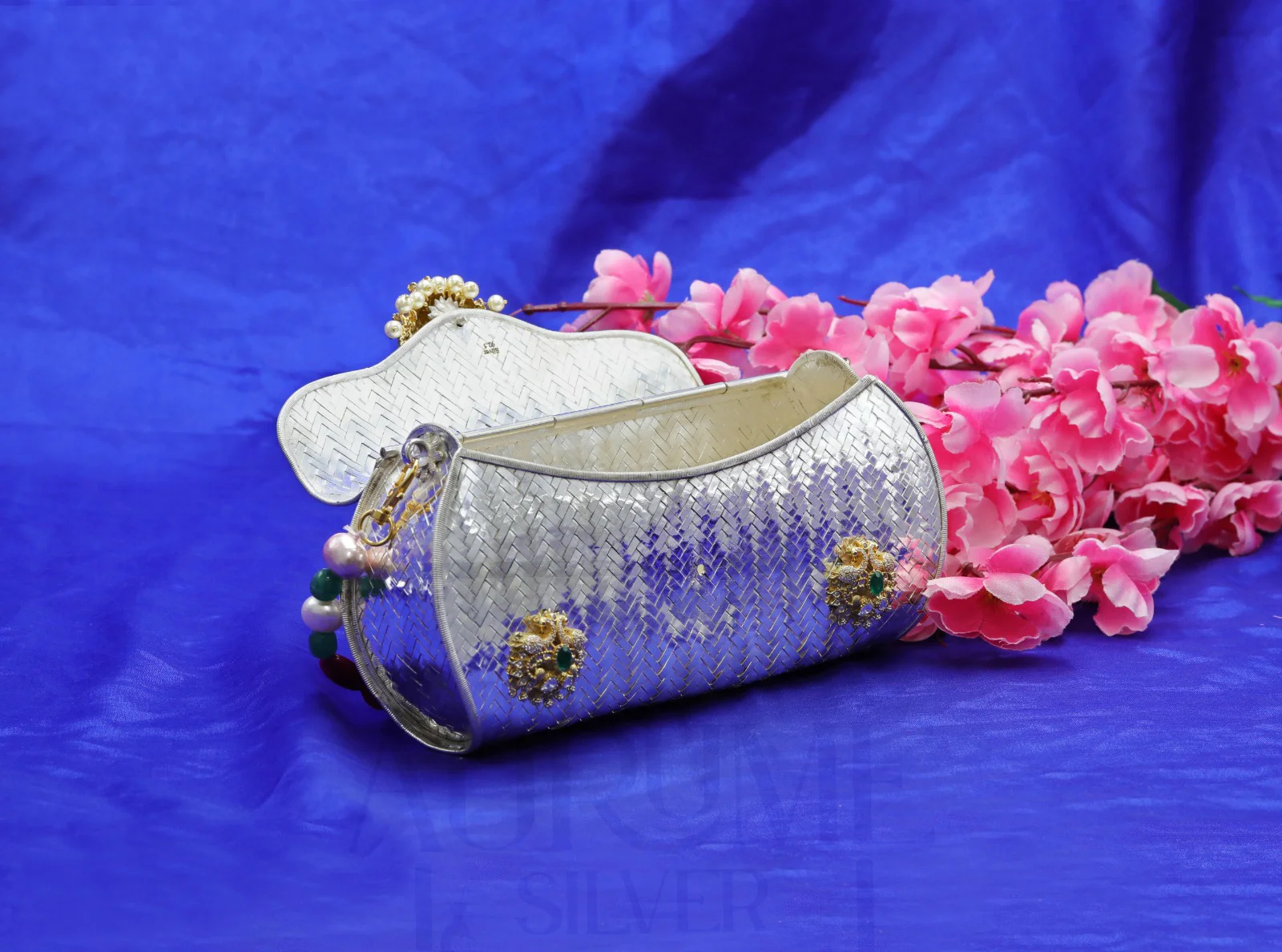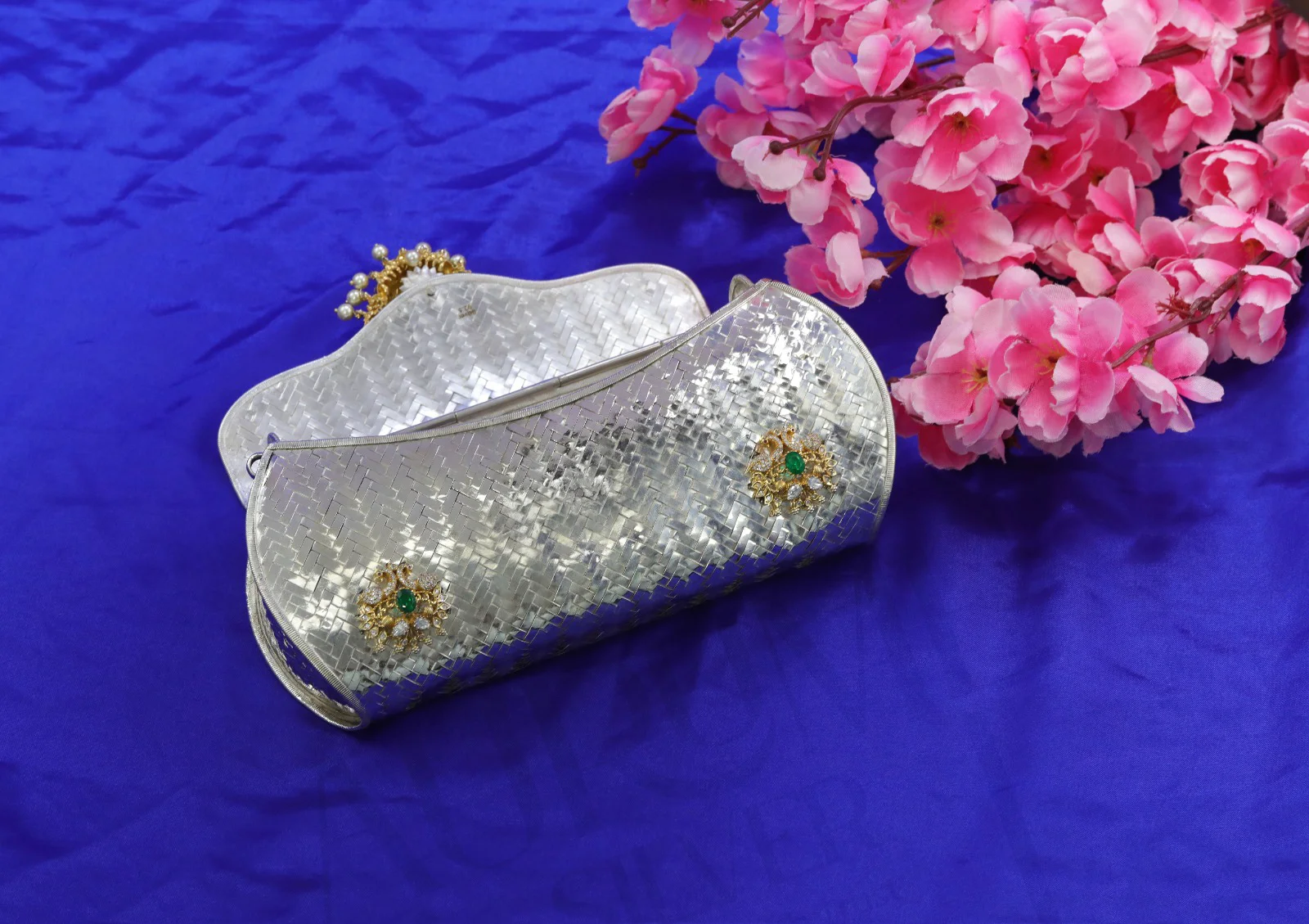 A divine blend of sacred symbolism and contemporary silhouette, the Shrinika Clutch is a handcrafted treasure that embodies grace, tradition, and prestige. Weighing 487 grams of 92.5% pure silver and measuring 9 inches (L) X 2 inches (W) x 5 inches (H), this semi-crescent clutch seamlessly fuses temple elegance with woven artistry.