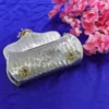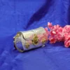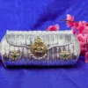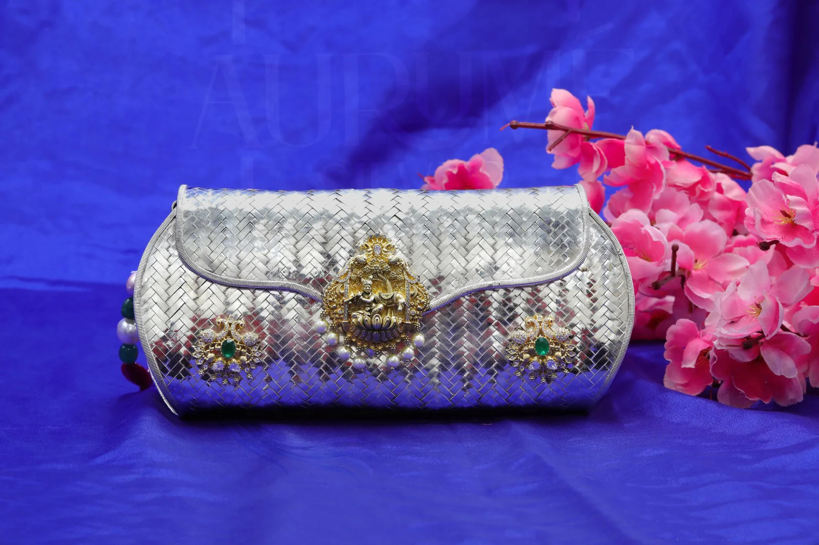 Flanking the central motif are two temple-inspired floral medallions, accented with emerald-hued stones and delicate filigree work. This design not only celebrates spiritual depth but also brings balance to the overall aesthetic, making the clutch both devotional and designer.