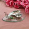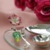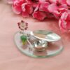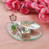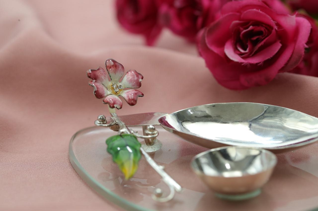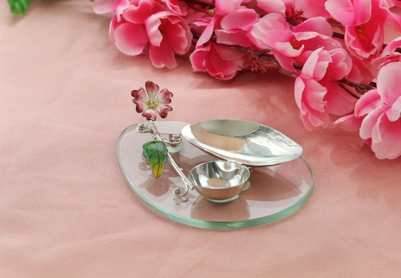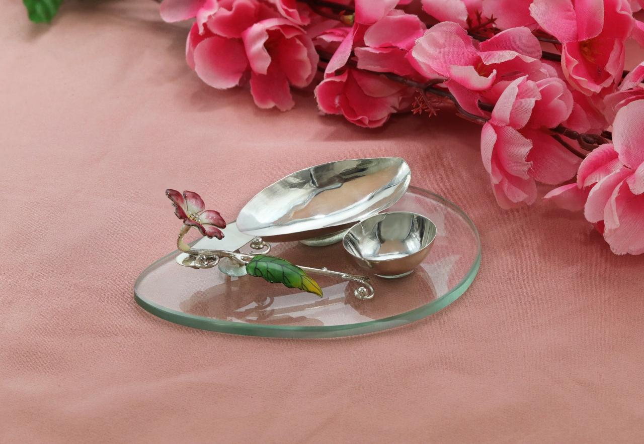 This delicate and modern oval-shaped silver chopda with enamel accents and a glass base is both festive and functional. Celebrate every sacred ritual with charm and grace using the Divyaleaf Chopda. This oval-shaped silver chopda features two compact bowls ideal for roli, chawal, or tilak essentials. It rests beautifully on a clear glass base, giving it a sleek, modern edge.