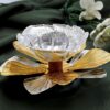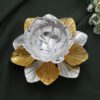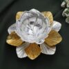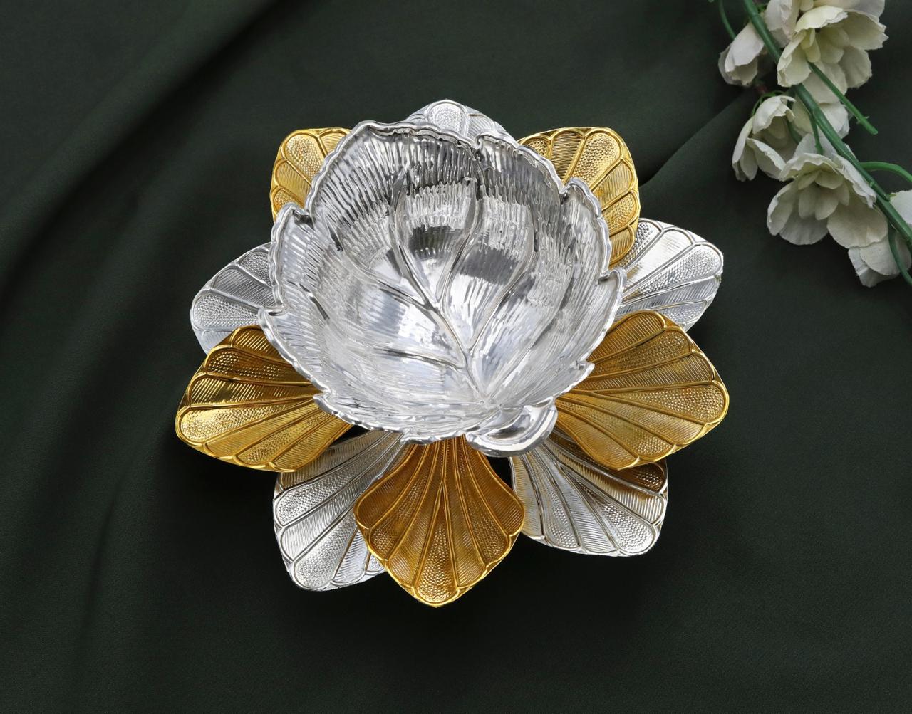 Elevate your sacred space or gifting tradition with the Lotus flame big Bowl— an exquisite handcrafted masterpiece symbolizing purity and abundance. At the heart of this piece lies a finely embossed pure silver bowl, delicately nestled within blooming layers of copper-toned petals, evoking the serene beauty of a lotus in full blossom. The bowl is set on a polished black marble base, adding stability and elegance to its spiritual appeal.