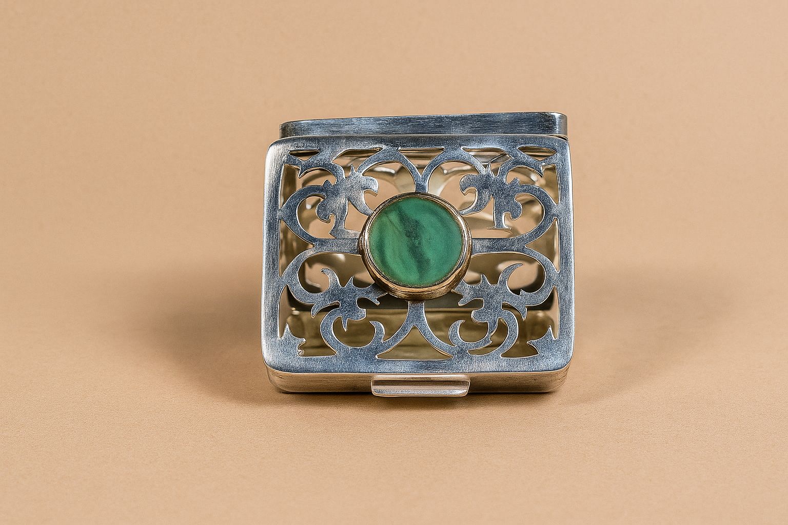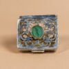 Compact yet captivating, the Shringarika Pushpa Silver Box is a handcrafted silver keepsake, featuring delicate jaali (filigree) work on its lid and a luminous green semi-precious stone centerpiece. Inside, it opens to reveal two neat compartments — perfect for roli-chawal, kumkum-haldi, or even as a travel-friendly trinket or pill box.