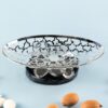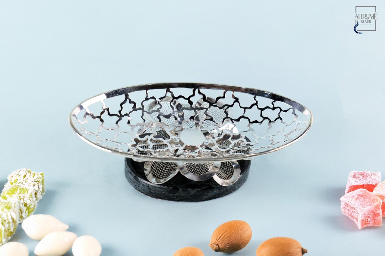 Celebrate craftsmanship with Lotus Jali, a silver-plated fruit tray that artfully combines contemporary jali cutwork with a blooming lotus-inspired base, all resting on a premium green marble pedestal. This statement piece is as functional as it is decorative — perfect for holding fruits, dry snacks, or festive offerings.