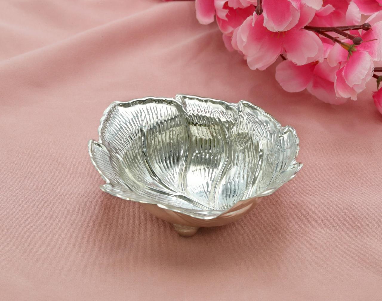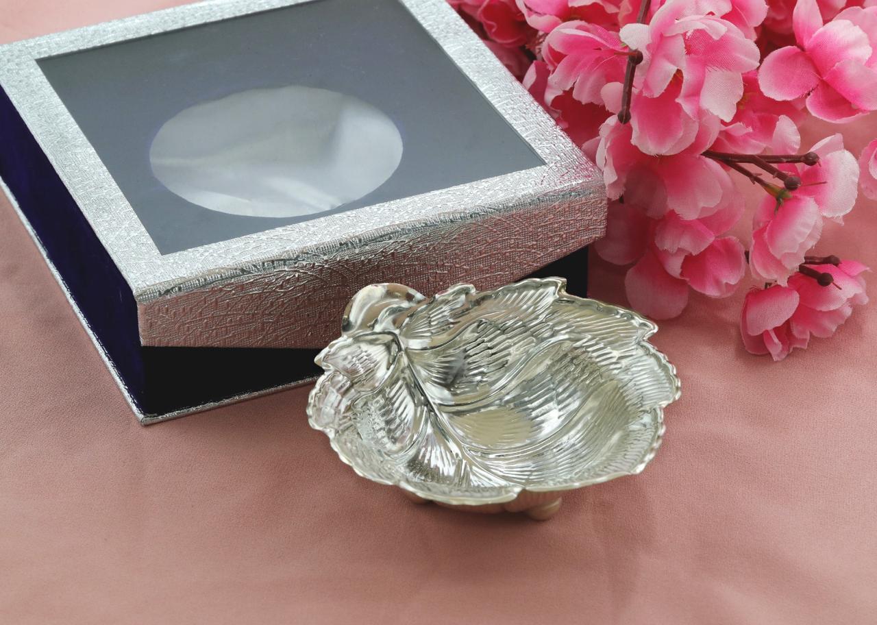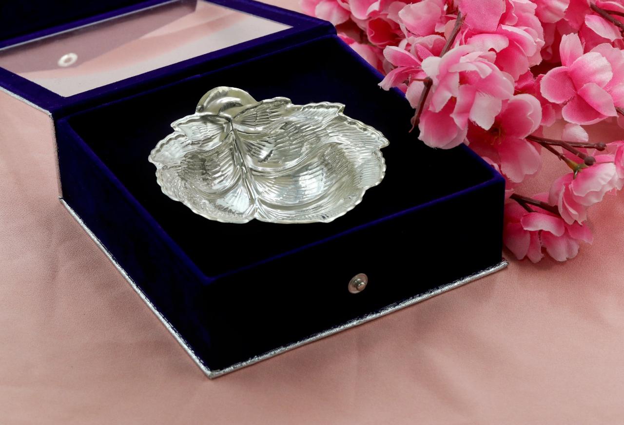 Introducing Patralekha, an elegant silver bowl inspired by the natural grace of a leaf. Intricately carved to replicate delicate leaf veins and contours, this handcrafted piece is a testament to timeless Indian artistry. Its sculptural form and organic flow make it a versatile addition to your space — ideal for serving dry sweets, storing trinkets, or gracing your pooja thali.