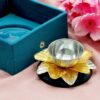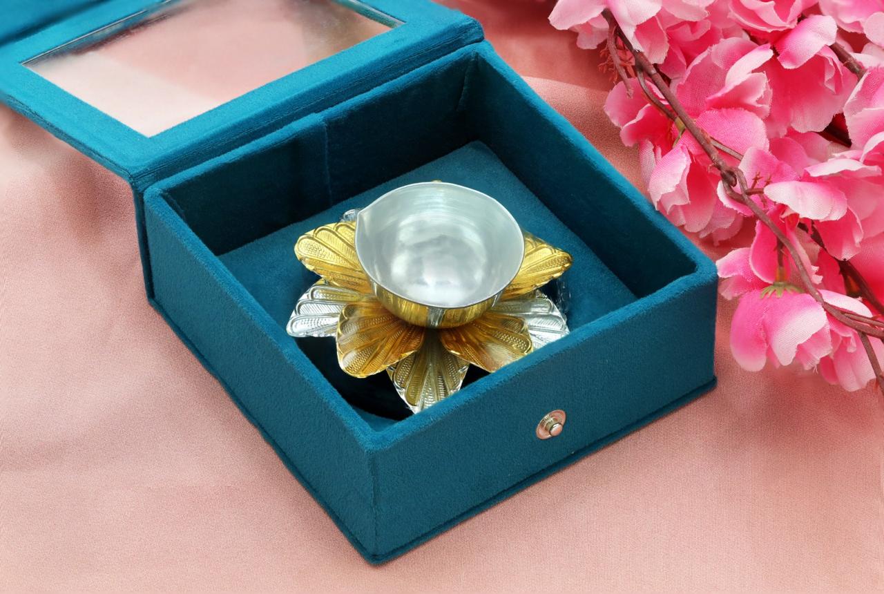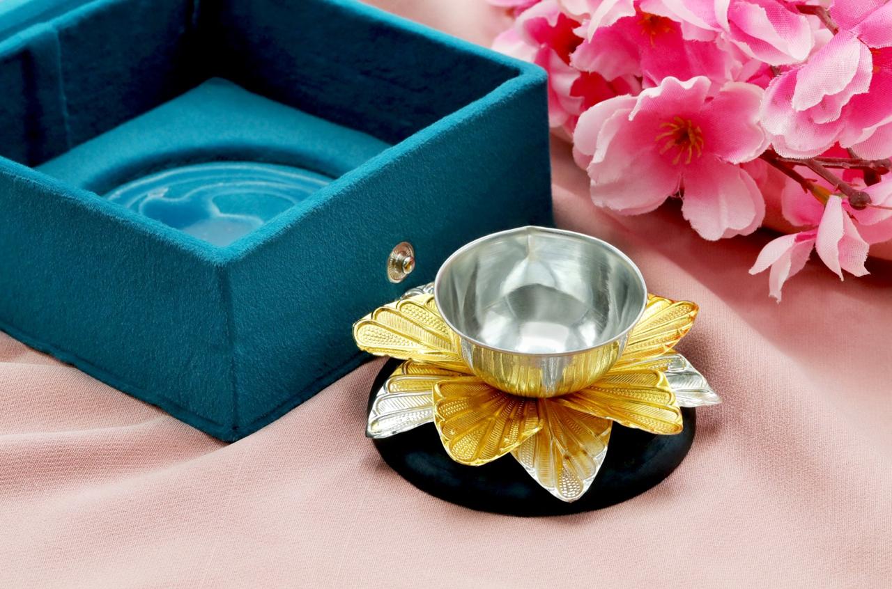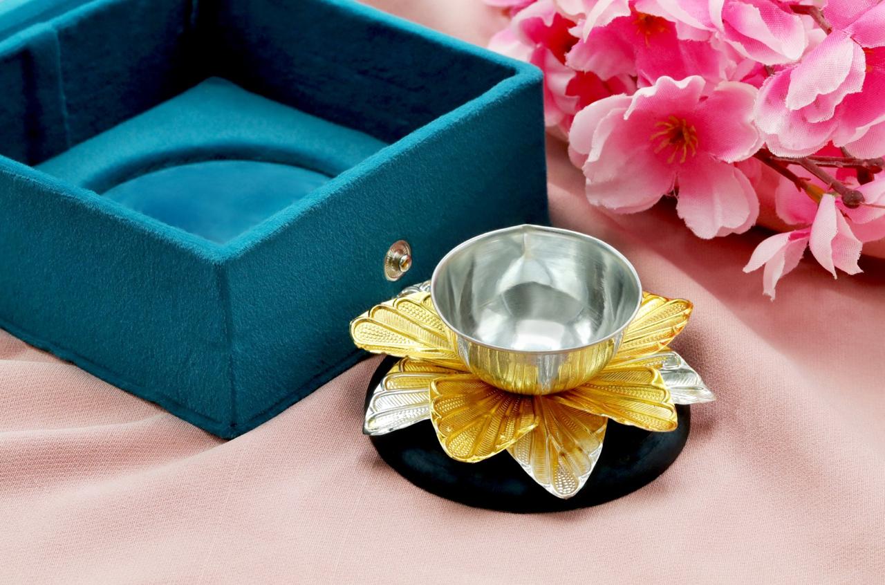 Radiating grace like a blooming lotus, the Lotus flame diya is a handcrafted diya that fuses silver radiance with copper-toned warmth, blooming on a sturdy marble base. Each petal is delicately textured, layered to reflect divinity and design, and surrounds a central silver diya bowl — perfect for lighting your sacred space.