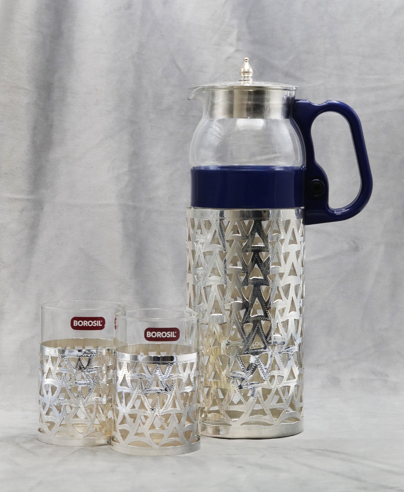 Where tradition meets modern convenience — the Trilume Cutwork Pitcher is designed to impress. This elegant glass jug features a beautifully crafted silver sleeve with intricate jali (cutwork) detailing, giving it a regal yet contemporary edge.